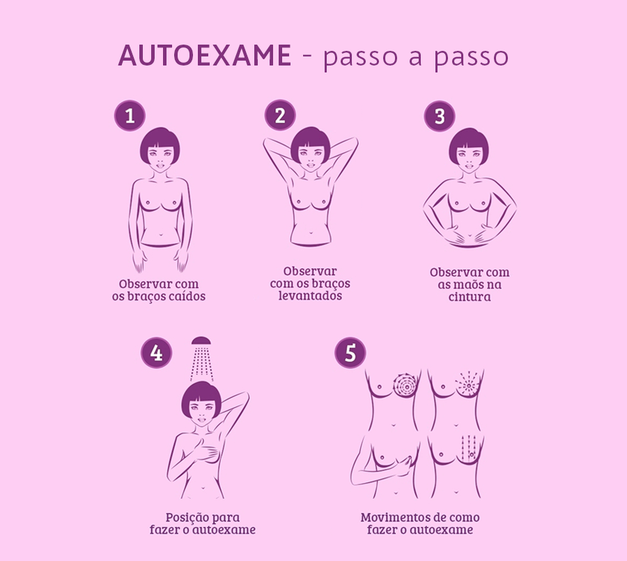 Um poderoso aliado no diagnóstico precoce é o autoexame da mama, que pode ser feito em casa. Confira abaixo como fazer o seu: